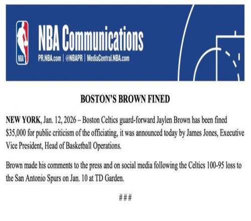 北京时间1月13日,NBA官方宣布,波士顿凯尔特人球员杰伦-布朗因公开批评裁判,被处以35000美元罚款。布朗是在1月11日凯尔特人于TD花园球馆以95-100不敌马刺的赛后,向媒体及社交媒体发表了相关言论。