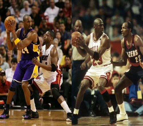 乔丹的正面突破,早年是靠迅雷般的第一步,重心却不会压科比这么低;科比的变向,节奏转换自如,虚虚实实之间,总能让人误判。