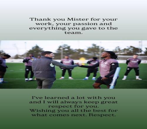 在主教练哈维-阿隆索离任后,皇马中场卡马文加在社交媒体发文告别。