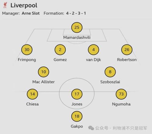 60分钟,斯洛特连换三人,维尔茨、埃基蒂克、科纳特分别换下弗林蓬、基耶萨、戈麦斯,利物浦多人位置大轮转——索博斯洛伊撤到右后卫,琼斯撤到后腰,恩古莫哈换到右路,加克波换到左路,维尔茨前腰,埃基蒂克突前。